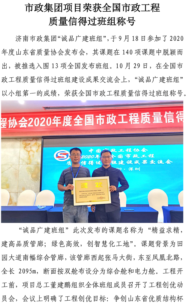 濟(jì)南市政集團(tuán)項(xiàng)目榮獲全國市政工程質(zhì)量信得過班組稱號