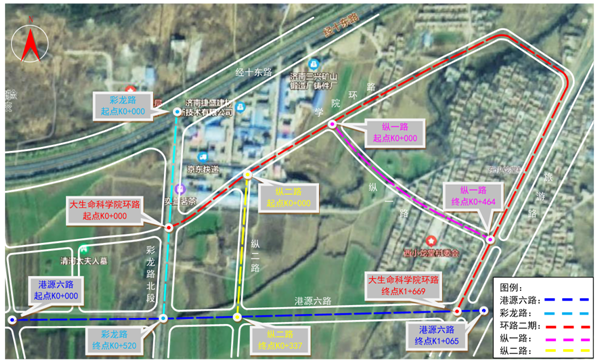 本項目建設單位為濟南高新技術產業(yè)開發(fā)區(qū)管理委員會財政性投資項目推進中心,工程位于濟南市高新區(qū),主要有港源六路、彩龍路、大生命科學院環(huán)路二期、縱一路、縱二路5條道路,道路總長3784米,施工內容為道路、排水、管線綜合、電力管溝、照明工程、交通設施工程、綠化工程和橋(涵)工程等,計劃工期540日歷天。