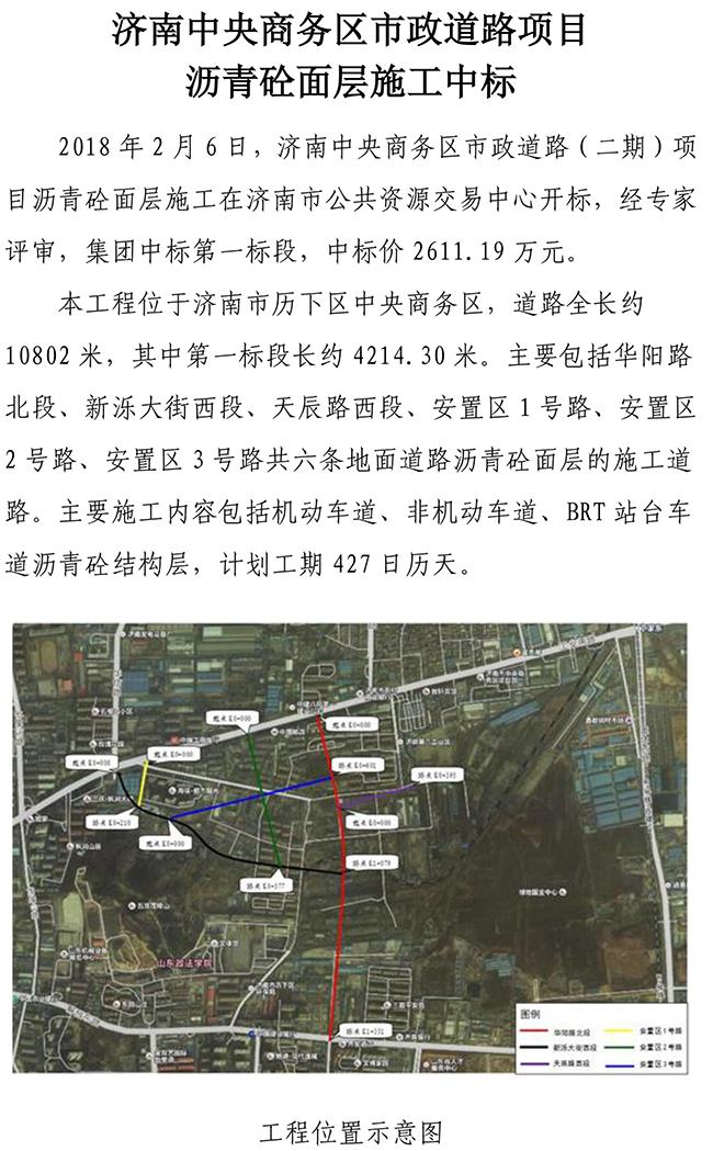濟(jì)南中央商務(wù)區(qū)市政道路項目 瀝青砼面層施工中標(biāo)