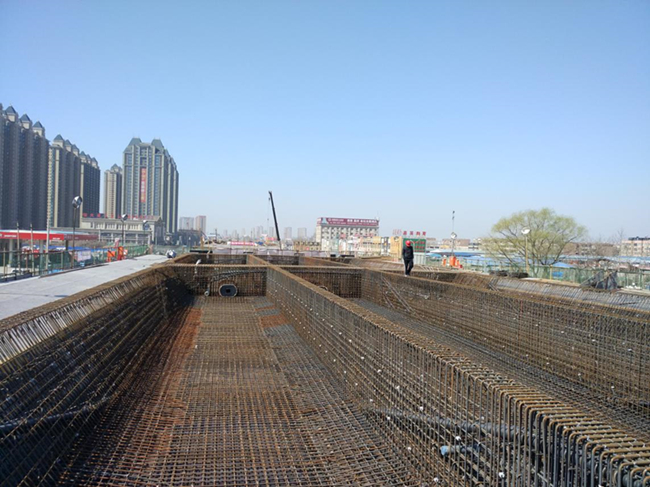 目前施工已大面積展開(kāi),截止到3月6日,綜合管廊支護(hù)開(kāi)挖累計(jì)完成740米,主體結(jié)構(gòu)澆筑完成460米;高架橋箱梁累計(jì)完成兩聯(lián),70聯(lián)鋼筋綁扎已完成,74聯(lián)箱梁支架正在搭設(shè)。