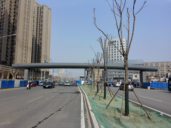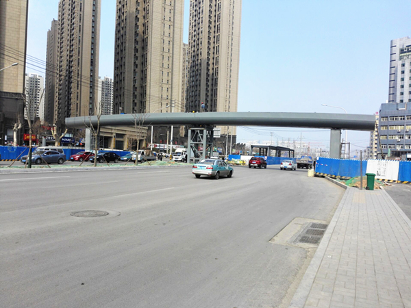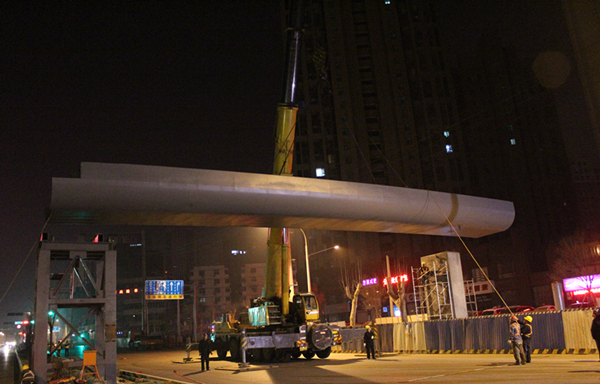 濟南市市政工程有限公司承建的緯十二路人行天橋工程包含兩座天橋,分別位于經(jīng)二路南側(cè)和經(jīng)五路南側(cè),均橫跨緯十二路。天橋兩側(cè)緊臨普通公交站臺,中間與BRT站臺相接,橋梁上部結(jié)構(gòu)采用鋼箱梁,橋梁全長60米,寬4米,共3跨,下部結(jié)構(gòu)采用鋼板墩,共設(shè)置5處步梯及3部垂直升降電梯,梯道寬2.5米。3月16日晚至3月17日凌晨,濟南市市政工程有限公司項目部進行經(jīng)五路南側(cè)人行天橋主箱梁吊裝施工。