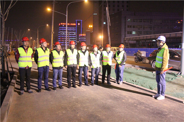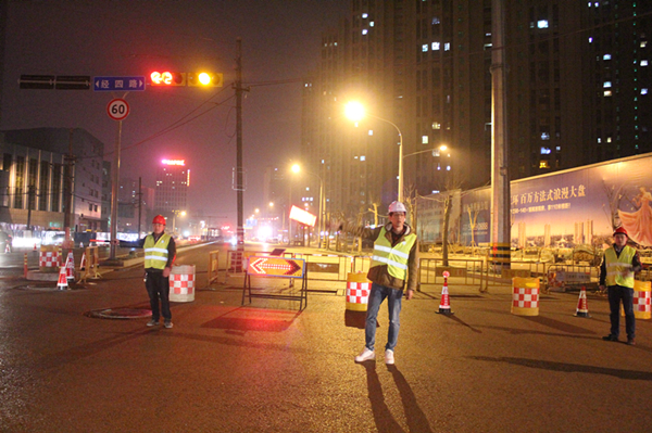 為保證吊裝工作順利進行,濟南市市政工程有限公司項目部提前策劃,與交警等相關(guān)部門充分溝通確定交通組織方案,建立吊裝安全保障小組并明確人員分工;同時為保證后續(xù)施工道路交通安全,濟南市市政工程有限公司項目部在南北兩側(cè)設(shè)立了臨時限高桿。3月16日晚11時現(xiàn)場正式封閉西半幅快車道吊裝西段主梁,在東半幅快車道中間進行隔離,南行及北行車輛分車道行駛,盧浮公館小區(qū)東門與緯十二路交叉口在西側(cè)箱梁吊裝期間進行封閉,車輛及行人繞行小區(qū)西門或南門。西段主梁吊裝完成后封閉東半幅快車道,吊裝東段主梁。濟南市市政工程有限公司于3月17日凌晨4時完成經(jīng)五路人行天橋主箱梁吊裝施工。