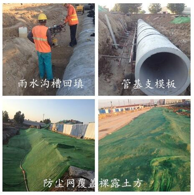 進行雨水管基施工,溝槽回填及現(xiàn)場防塵網(wǎng)覆蓋工作
