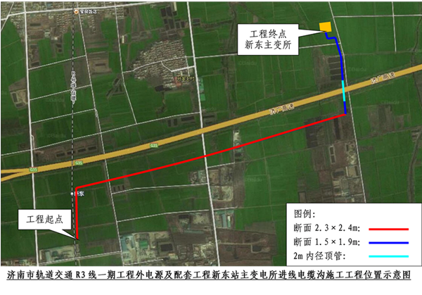 本工程位于濟(jì)南新東站片區(qū),工程起點(diǎn)為新東站片區(qū)規(guī)劃北環(huán)路,北至穿越濟(jì)青高速最終至R3線濟(jì)南東站。新建電纜線路3000m,其中2.3×2.4m電纜溝2400m ,1.5×1.9m電纜溝450m,2.0m內(nèi)徑頂管150m(鉆越濟(jì)廣高速)。工期為180日歷天。